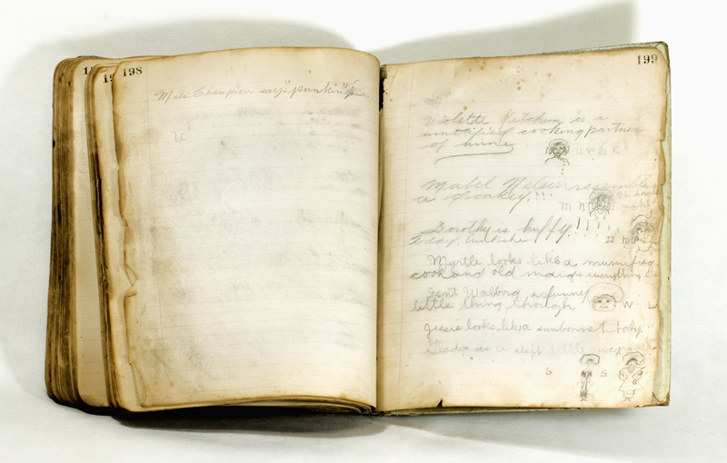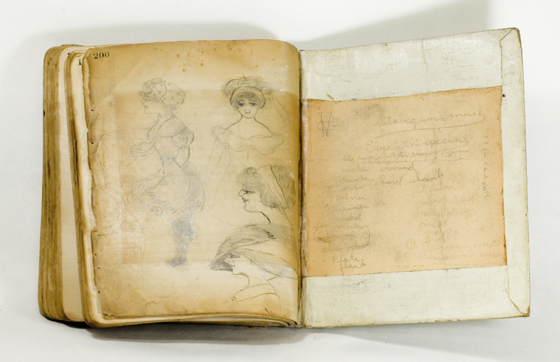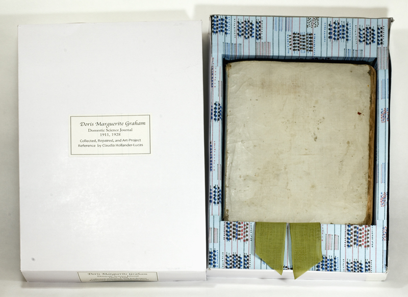 Who was Doris Marguerite? What brought her to Seattle from Minneapolis? How did this journal turn up in a heap of household belongings of two aged African American sisters who died in a shambled house on Mercer Street in 1982? I quickly rescued the journal, and based several creative projects over the decades upon some of the entries, such as How to Sweep and Dust, and on Doris’ gossipy marginalia throughout the journal with Edwardian pencil drawings on the front and back end-sheets. Recently I repaired torn pages, re-enforced the spine, made a proper box for the journal, and made notes for future projects. Who can resist entries such as What is Water, Uses for Stale Bread, recipes for Corn Pudding and Raisin Pie? Whoever Doris was, she comes alive again through her journal as a coming-of-age Edwardian lady.